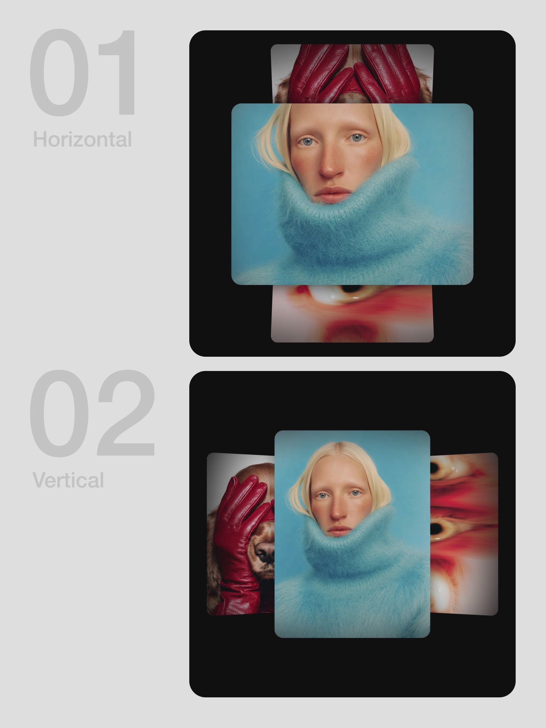 A clean, adaptable slideshow built for any purpose. Each of the 3 versions includes both vertical and horizontal movement, keeping the focus on one visual at a time while subtly hinting at what’s next.