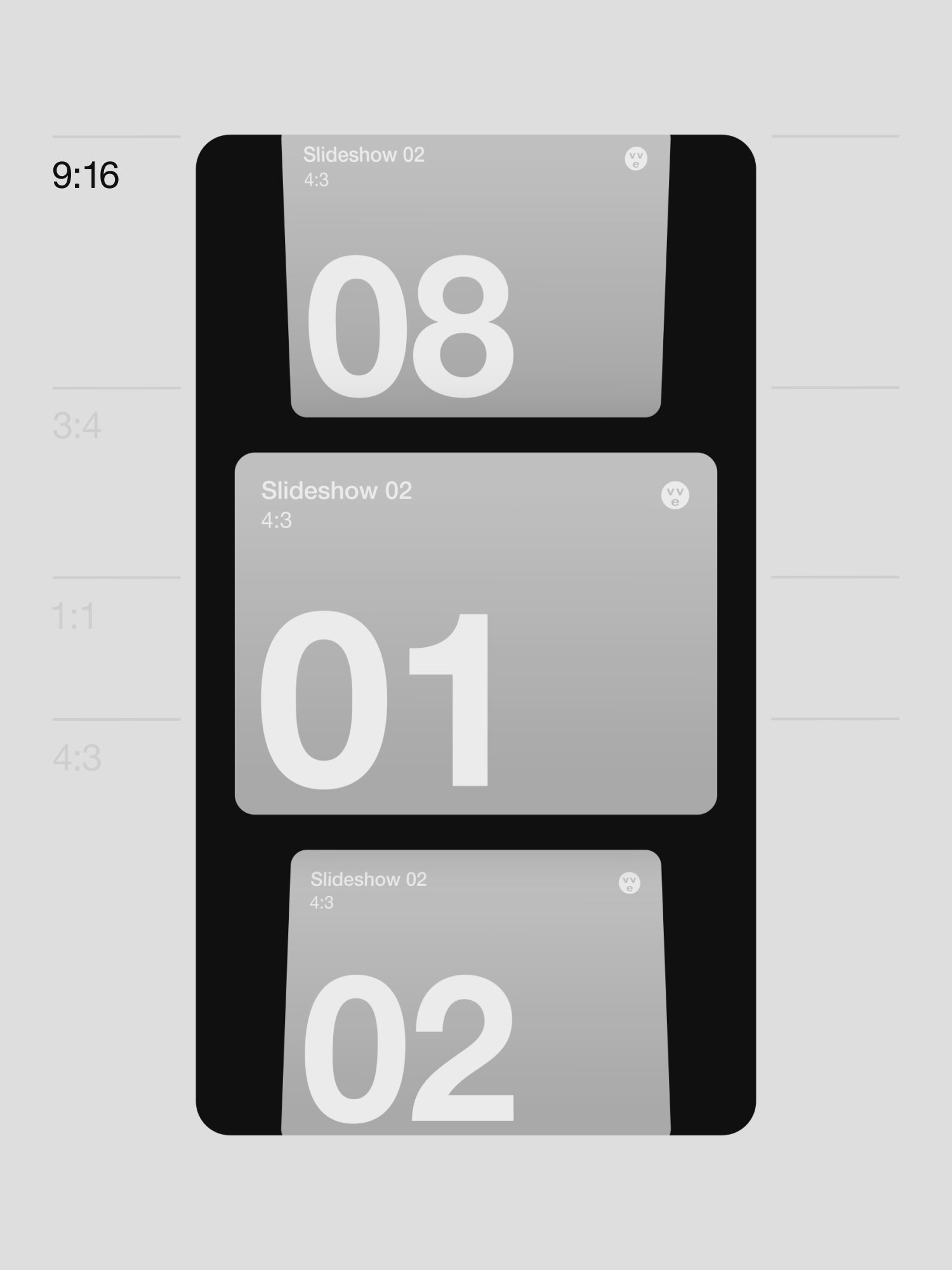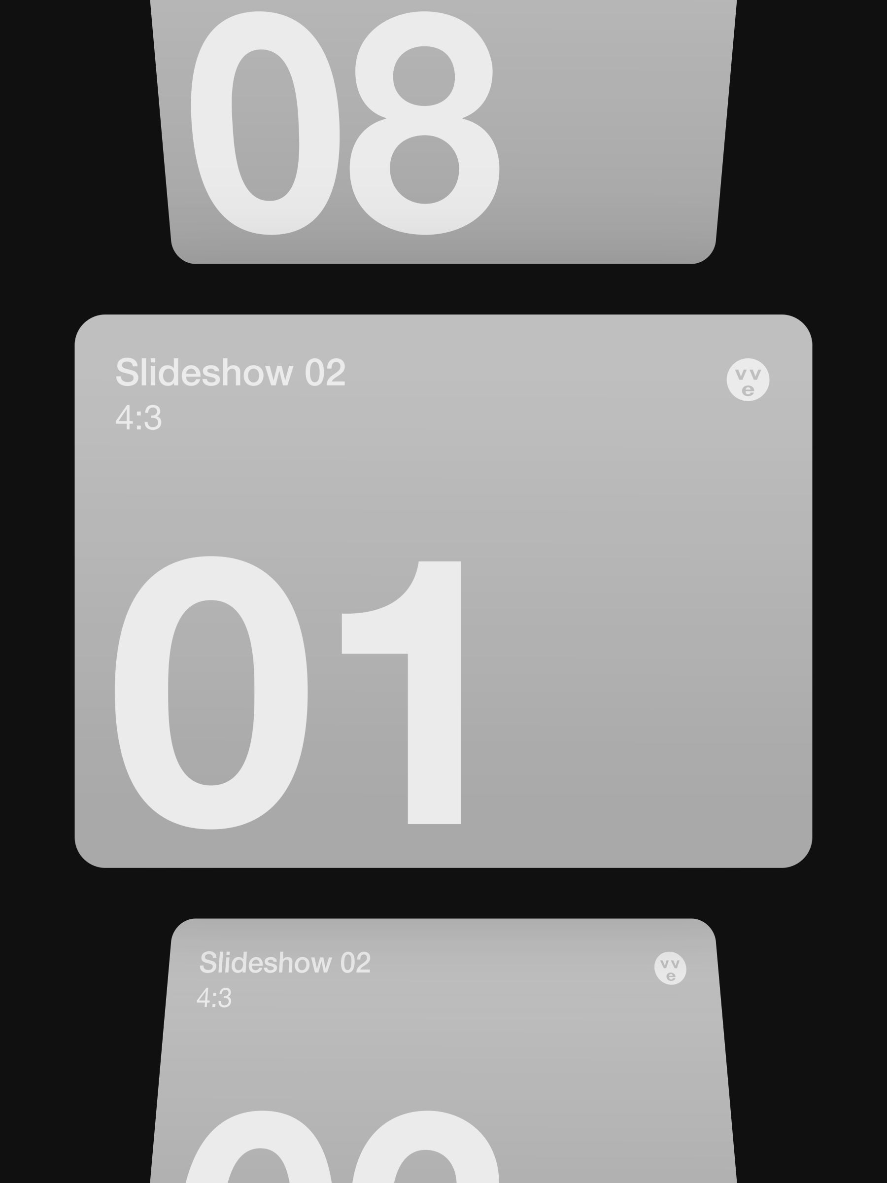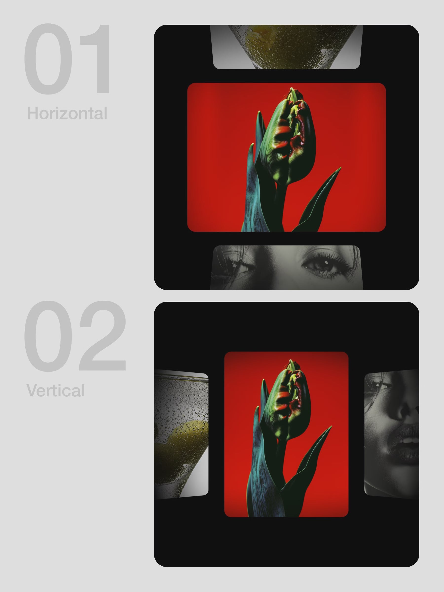 A clean, adaptable slideshow built for any purpose. Each of the 3 versions includes both vertical and horizontal movement, keeping the focus on one visual at a time while subtly hinting at what’s next.